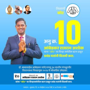 डॉ. बाबासाहेब आंबेडकर यांचे पण तो तसा भारतीय बौद्ध महासभेच्या माध्यमातून सामाजिक धार्मिक कार्य करणारे आदरणीय राजरत्न आंबेडकर यांनी वाशीम मंगरूळपीर विधानसभा मतदारसंघांमध्ये अपक्ष फॉर्म भरलेला आहे आणि या उमेदवारीमुळे वाशिम मतदार संघामध्ये त्यांना मोठ्या प्रमाणामध्ये प्रतिसाद वाढताना दिसून येत आहे राजरत्न आंबेडकर यांनी खेडोपाडी जाऊन लोक सामान्य माणसांचे भेटीसाठी असल्यामुळे लोकांना त्यांच्या विषयातील ते जिव्हाळा आणि आत्म्याचा निर्माण झालेली आहे वर्तमान लखन मलिक या आमदारांचे तिकीट भाजपने कापल्या मुळे ते भाजप वर नाराज आहेत व त्यांचा फायदा झाला आपक्ष