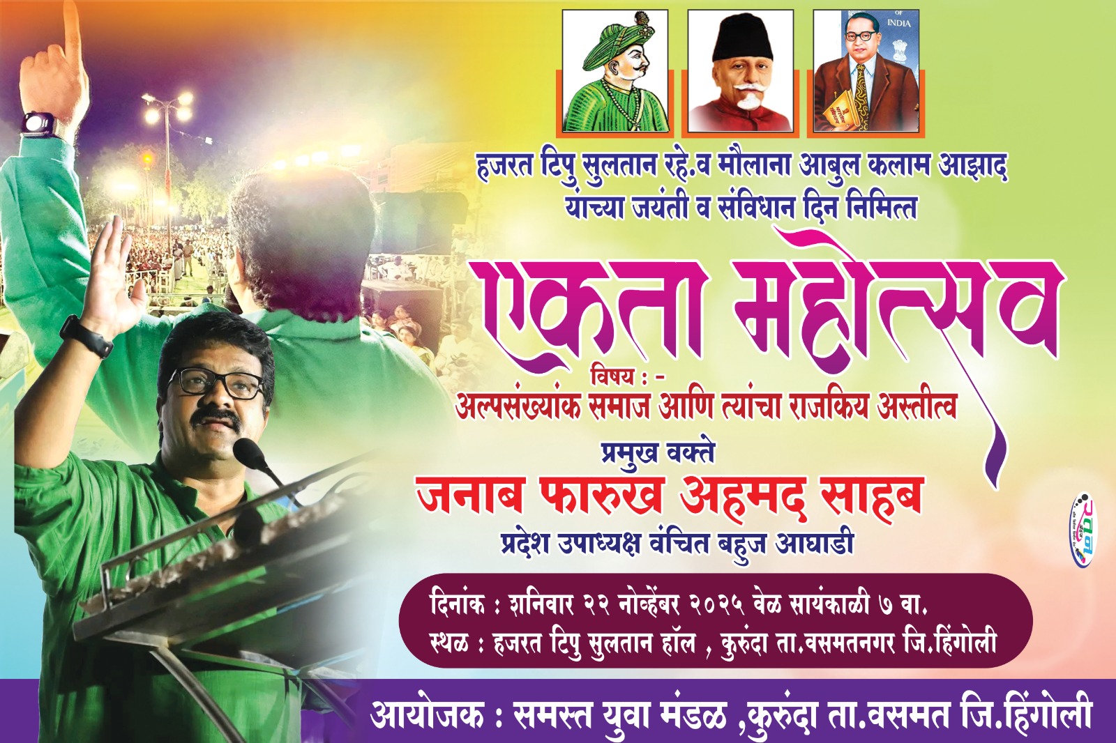 हा एकता महोत्सव दिनांक २२ नोव्हेंबर २०२५ रोजी सायंकाळी ७ वाजता कुरुंदा येथील हजरत टिपू सुलतान हॉल येथे आयोजित करण्यात आला आहे.